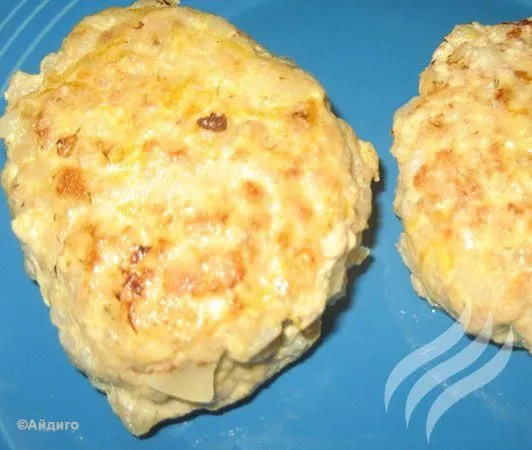 В фарш добавить яйцо, рис и обжаренные овощи. Посолить и поперчить. Добавить приправу "Курочка пряная".