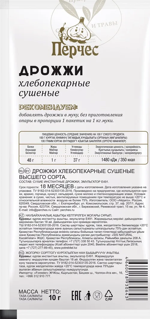 Дрожжи используются в кулинарии для приготовления хлеба, пива, вина и других продуктов. Они содержат ферменты, которые превращают сахара в углекислый газ и спирт. Это приводит к тому, что тесто поднимается и становится пышным. С сухими быстродействующими дрожжами тесто всегда получается пышным и нежным. Рекомендуем добавлять дрожжи в муку, без приготовления опары, в пропорции 1 пакетик на 1 кг муки.