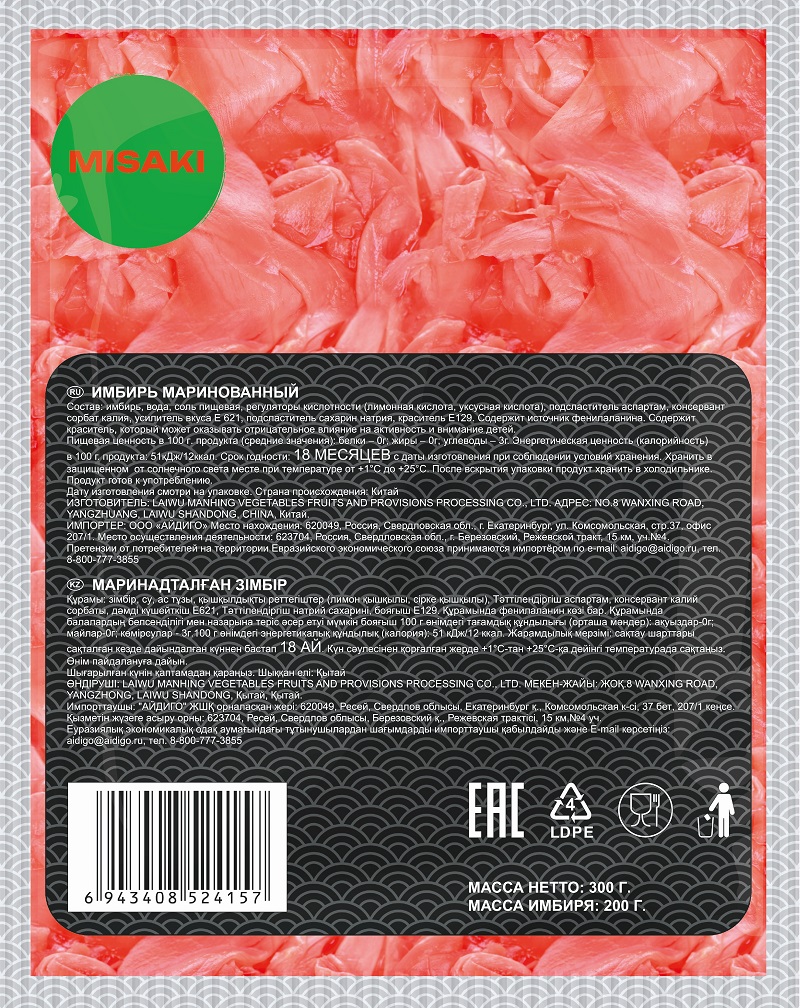 Состав: имбирь; вода; соль; лимонная кислота; уксусная кислота; аспартам сорбат калия; усилитель вкуса (E621); сахарин натрия; пищевой краситель (Е129).
