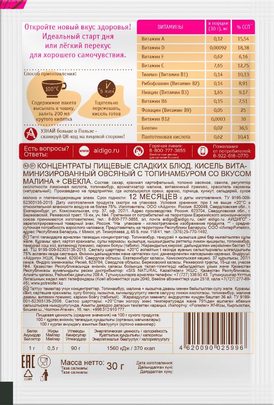 Овсяный кисель моментальный с топинамбуром, малиной и свеклой - это полезный и быстрый в приготовлении напиток. Чтобы насладиться его вкусом, просто залейте смесь из пакетика кипятком, и через пару минут получите ароматный кисель. Пакетик рассчитан на кружку 200 мл. Моментальные кисели Айдиго удобно брать с собой на работу, в поездки, на прогулки или в поход. Такой напиток отлично подойдёт для детского полдника или лёгкого перекуса вне дома.