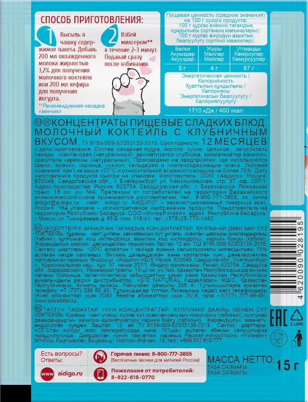 Со смесью можно приготовить 1 порцию ароматного молочного коктейля - добавьте содержимое упаковки в 200 мл молока или кефира, взбейте в шейкере или блендере около 2-3 минут.