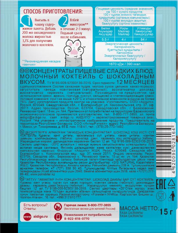 Молочный коктейль со вкусом шоколада порционный - это сухая смесь для приготовления любимого напитка и идеальный выбор для тех, кто ценит нежный и натуральный вкус.