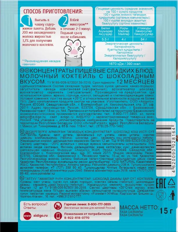 Со смесью можно приготовить 1 порцию ароматного молочного коктейля - добавьте содержимое упаковки в 200 мл молока или кефира, взбейте в шейкере или блендере около 2-3 минут.
