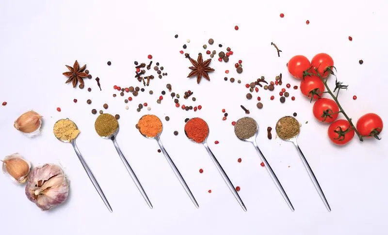 Ароматные пряности: петрушка, укроп, базилик, куркума, кориандр, паприка, паприка копченая сладкая, чеснок и имбирь;